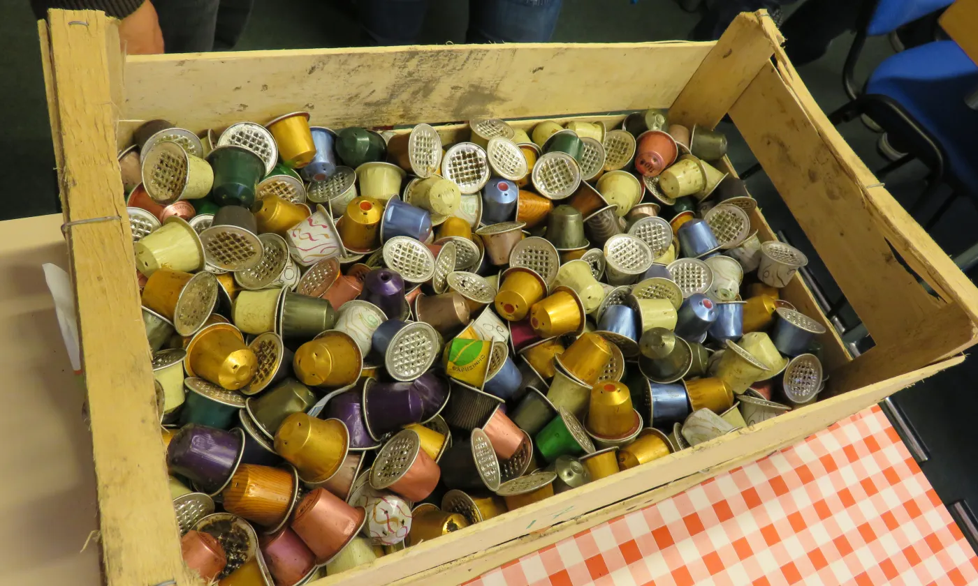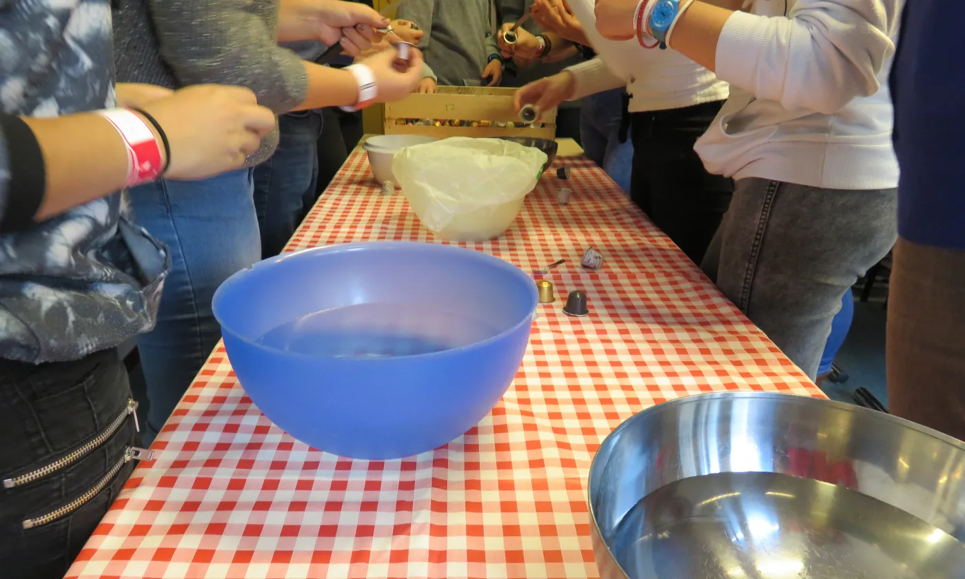 Autre atelier, autre ambiance. A la maison de la catéchèse, Anne-Catherine Menu et sa comparse animent une série d’activités en lien avec l’écospiritualité. le groupe de catéchumènes «Lac en ciel» du bout du lac de Bienne vient d’arriver. Ils ont timidement déposé vestes et sacs dans l’entrée et ont pris place à même le sol. Les animatrices sont sur le point de commencer quand un second groupe fait son entrée. Ils sont en retard. Ce matin, dans la salle de gym qui les accueillait pour la nuit, le réveil s’est fait aux aurores, mais le petit-déjeuner, lui, n’a jamais pointé le bout de son nez. Au programme de l’atelier, du bricolage autour de capsules de café. Elles sont violettes, vertes ou orange. Leur opercule est percé. Entassées dans une cagette de bois, les capsules semblent attendre leur triste sort. Les animatrices parlent de l’importance du recyclage sous le regard ensommeillé des jeunes assis en tailleur. Pas le temps de rejoindre les bras de Morphée, on se traîne jusqu’à la pièce du fond aménagée pour l’occasion. Sur les tables recouvertes de toiles cirées, perles, pistolets à colle, planches en bois et morceaux de caoutchouc. Départ. On nettoie et on écrase les capsules de café, on sélectionne des perles, on choisit sa ficelle de caoutchouc. On rit un peu, on oublie beaucoup les consignes. Pendant deux heures, on crée, à partir de matériaux de récupération des petits pendentifs, souvenirs déjà destinés aux parents.