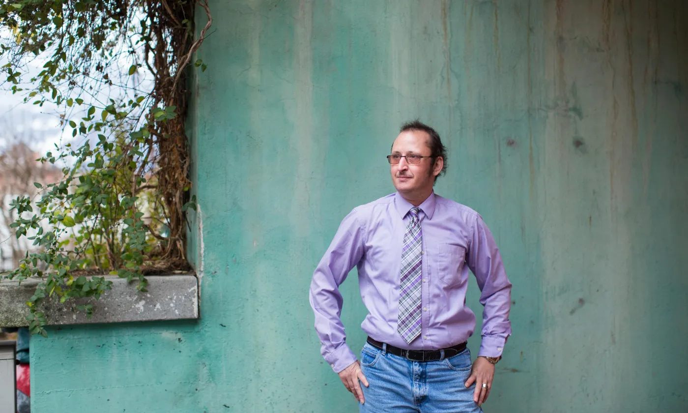Il a les mains dans les poches d’un veston en cuir noir, tout droit sorti d’un clip de rock des années 1980. Les manches dézippées dévoilent une chemise mauve. Il a appuyé son dos contre l’un des poteaux qui soutient le couvert de la gare de la bourgade vaudoise ceinturée par les Alpes déjà enneigées. Immobile, Franck m’attend. A la sortie du train, je me dirige vers lui sans hésiter. Ce sont ses yeux qui scrutent les passagers sortant du train qui l’ont trahi. Premier contact visuel, premiers sourires. Ils ponctueront une matinée et le récit d’une vie jalonnée de souffrances, sur le point de basculer.