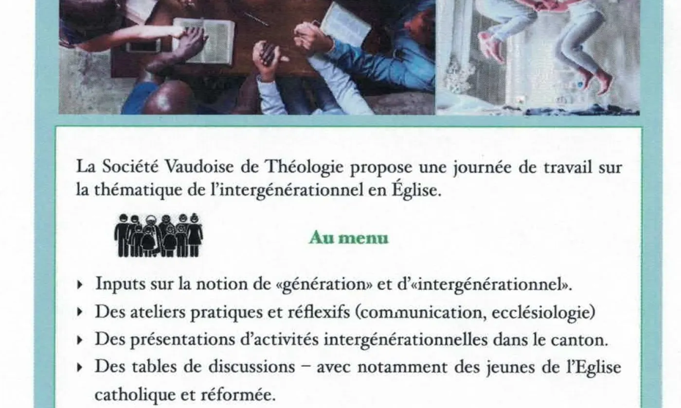 La Société Vaudoise de Théologie propose une journée de travail sur la thématique de l'intergénérationnel en Eglise. Présentations, ateliers pratiques, tables de discussions .