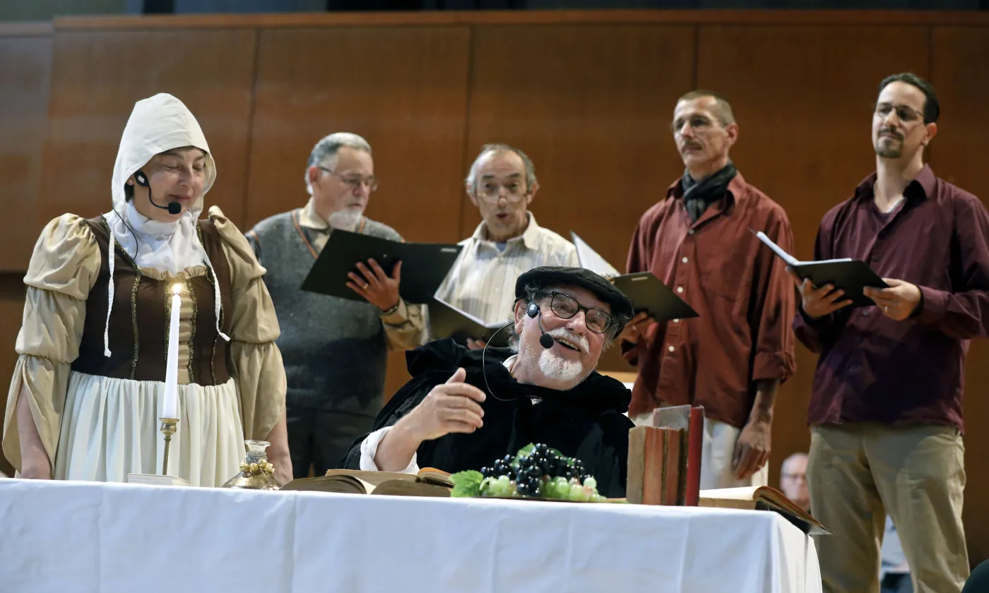 LUTHERANISME Le ménestrel (Bertrand Parel) s’avance vers la scène en costume d’époque. Il annonce au public qu’il va leur conter la belle saga de Martin Luther. En réponse à son intervention, le chœur situé à l’arrière du public entonne le psaume «Réjouis-toi, peuple fidèle». Le ménestrel poursuit son récit et relate la naissance du Réformateur dans une époque où la peur du diable et la question du salut occupaient une place prépondérante. Un Moyen Age dans lequel l’Eglise oscillait entre le meilleur et le pire. Après s’être déplacé en direction de la scène principale, le chœur chante un autre psaume qui sert à introduire les récits des jeunes années du personnage. On apprend qu’il a eu une éducation sévère et que son père le destinait à une carrière de juriste. Il avait également quelques problèmes avec l'autorité. Resté silencieux au milieu de la scène depuis le début de la représentation, Martin Luther (Jean-Pierre Roth) repense à cette époque avec une certaine nostalgie.