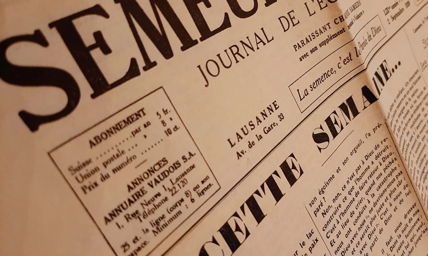 «Lundi soir. Une lune splendide joue sur le lac et met une clarté rayonnante de paix sur nos campagnes. Le Conseil fédéral vient d’ordonner la mobilisation des troupes de couvertures de la frontière et de prendre des mesures pour la restriction de la vente de denrées alimentaires. Les Chambres fédérales sont convoquées pour mercredi afin d’élire le général de notre armée. […]», Telles sont les premières lignes de la rubrique «Cette semaine…» en première page du Semeur vaudois — journal de l’Église nationale du 2 septembre 1939, dont un exemplaire m’a été offert cet été lors d’une brocante. Le fascicule de quatre grandes pages dont une entièrement couverte de publicités témoigne de l’anxiété, mais aussi de la confiance en Dieu de ces croyants qui nous ont précédés.