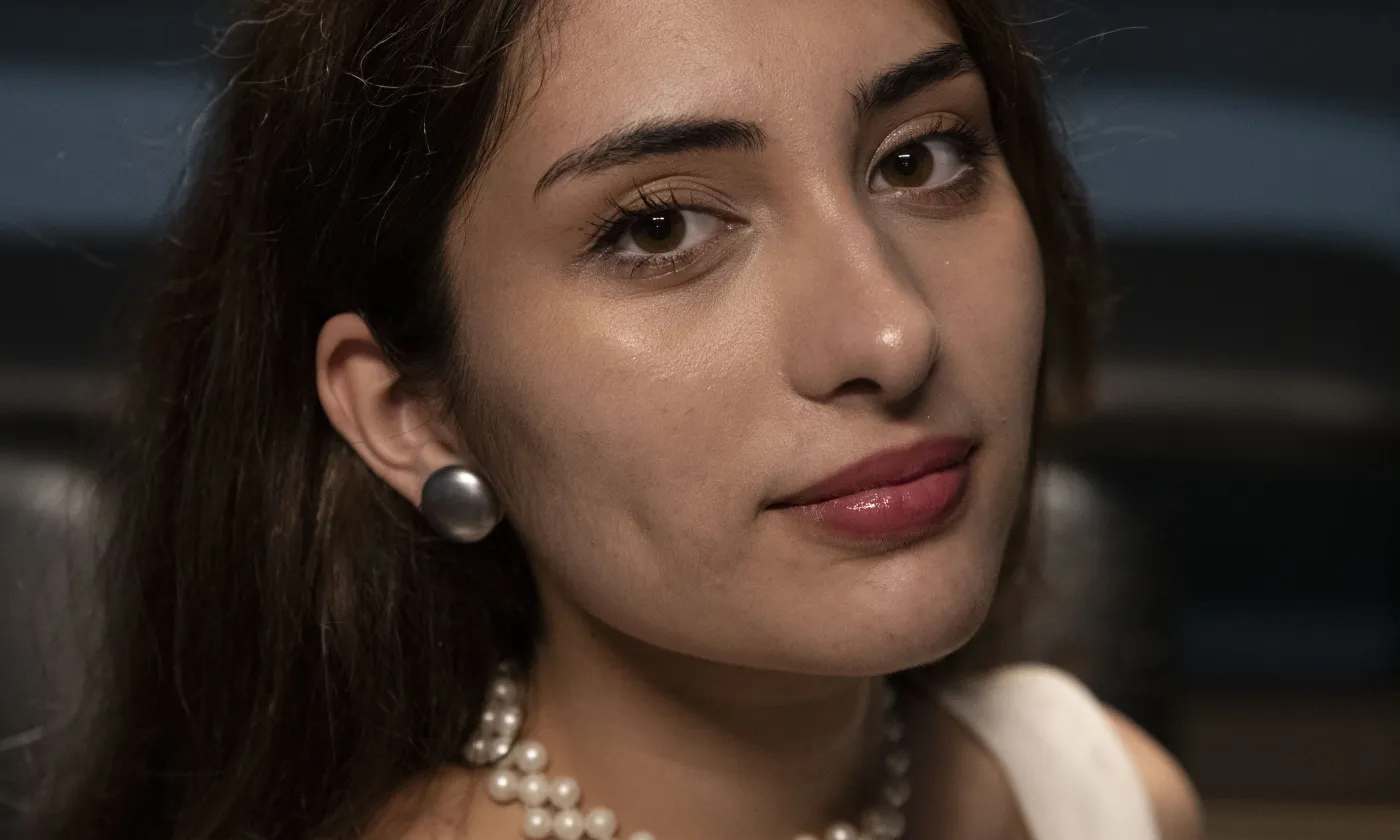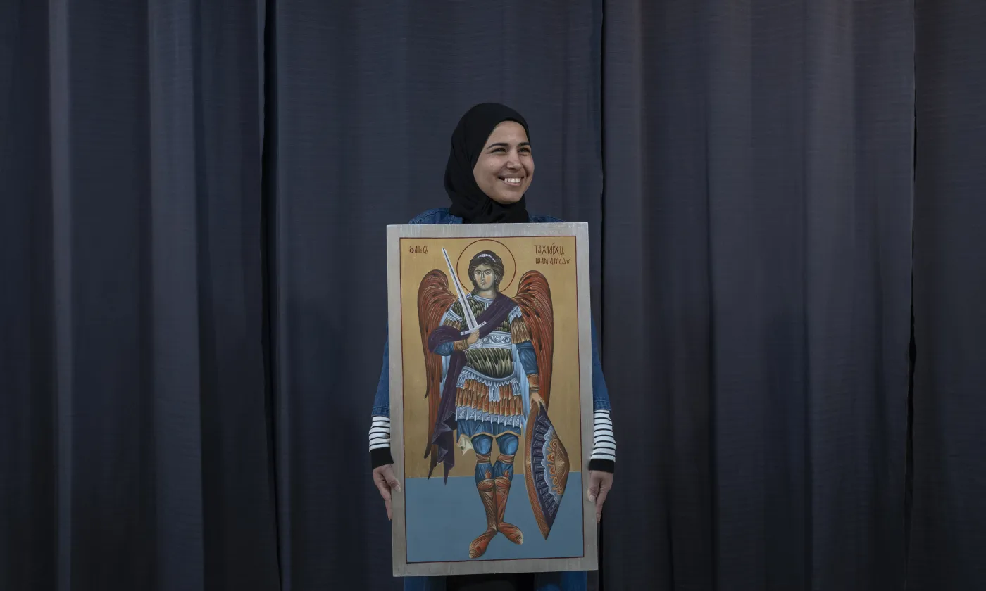 Portrait de Zekra Laaly, jeune artiste originaire de Deir ez Zor. Elle présente une icône de l'Archange Gabriel. L'artiste de confession musulmane s'est spécialiée dans la peinture d'icônes chrétiennes de style byzantines qu'elle réalise dans un atelier du centre communautaire jésuite de Beit Alberto Hurtado SJ à Jaramana. Implanté dans un quartier populaire de la banlieue de Damas accueillant de nombreux déplacés de la guerre et une importante diversité religieuse, le centre propose différents ateliers artistiques, formations éducatives, activités spirituelles, culturelles et sportives. Jaramana, Syrie, 24 mars 2025.